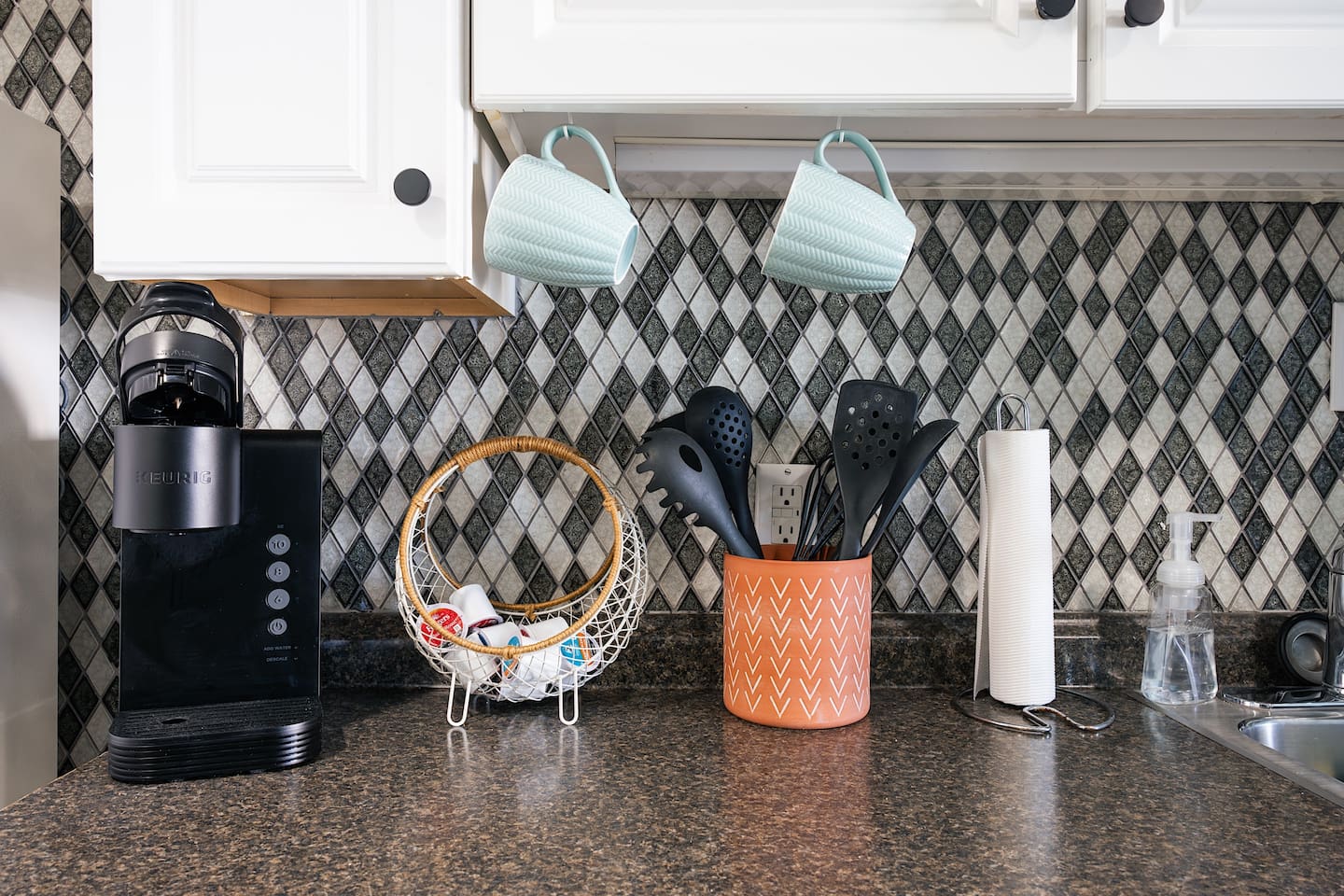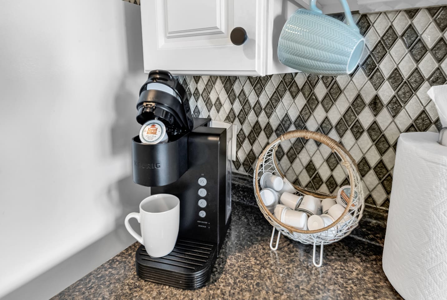 Featuring a plush king bed in the bedroom and a sleeper sofa in the living area, the unit is perfect for couples, small families, or a getaway with friends. The fully equipped kitchen has everything you need to cook in — refrigerator, stove, microwave, Keurig coffee maker, dishwasher, blender, dishes, and all the essentials. High-speed WiFi, 65-inch flat-screen TV with cable, and central air conditioning make sure you're comfortable around the clock.
