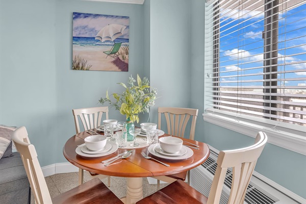 Round dining table set for 4 — perfect for meals with a view of the ocean outside